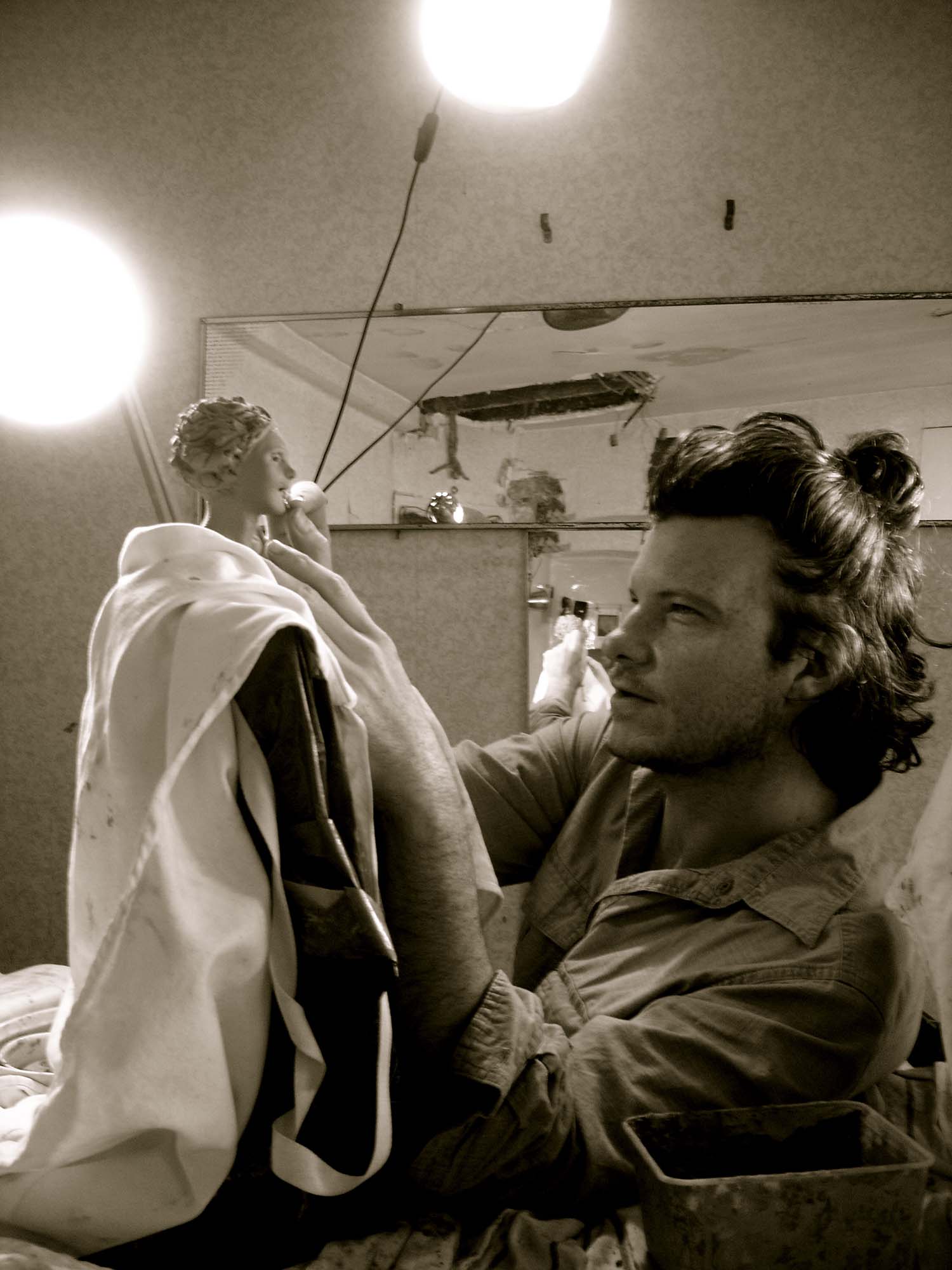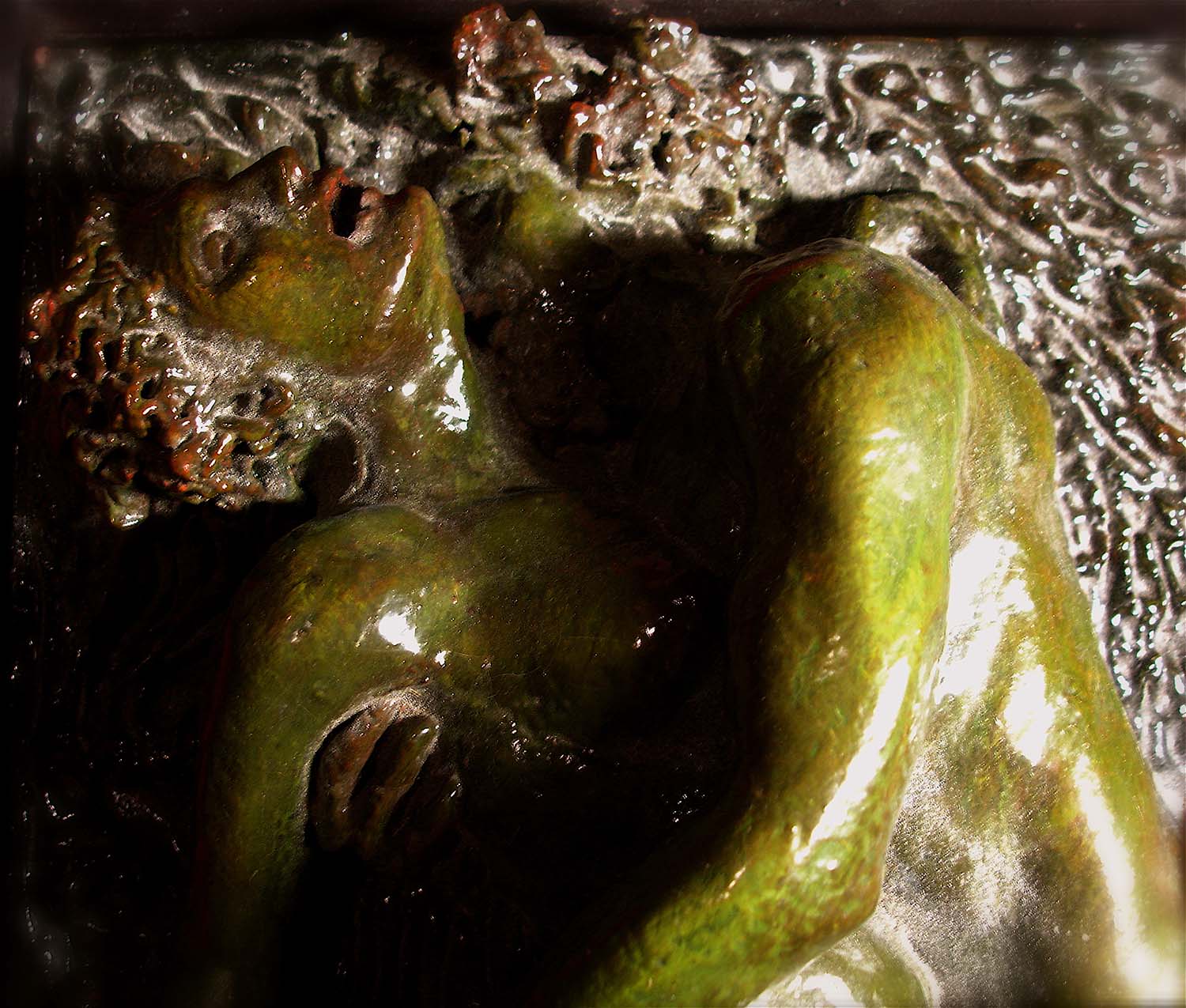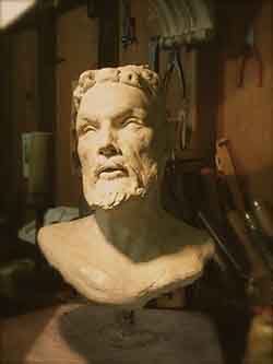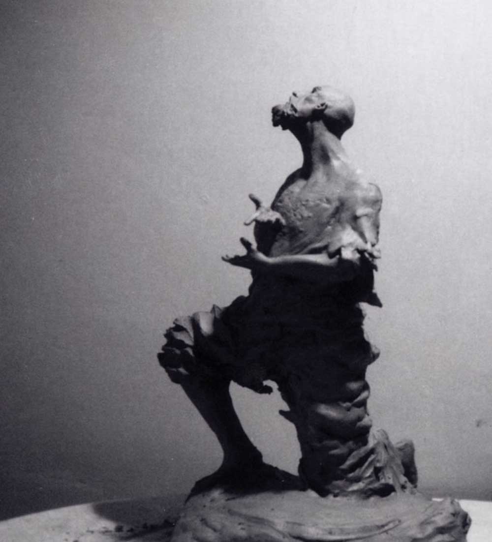 “...it's still about drawing from the representation of Nature's form within a mass of earthen clay and raising from it’s surface it’s relationship to negative space. Sculpture presents many more challenges for me than painting, although just as many disasters have occurred in each medium. A stranger once wrote me during a time of struggle, suggesting to let it pour through the hands. Fingers make the most efficient tools and where they cannot reach there is a chopstick. A sculpture in all stages of metamorphosis entices the artist to master creating in the third dimension. How intricate the relationship with these transformations dictates the result of the final form. As in painting, the artist must know the surroundings which lie beyond the view and what influence they have on the figures and forms sprouting from the atmosphere contained within the scene. Loose strokes can be powerful in sculpture as they bear witness to it’s evolution. Instincts of drawing, composition, shadow value, and surface texture combine with the balance of moisture and drying time to give inspiration to the work in progress. Extracting forms from clay is to portray their birth. The artist labors long to find the truth, which is derivative of the deepest primal meaning, At the same time, the artist exists in harmony with the present condition leading into the future of the complete work. Archetypal, symbolist, allegorical; in sculpture, as in painting, there is but one image to present. It's not a moving picture, so it hasn’t the luxury of multiple chapters to explain it’s intention. It must embody all the emotional references of life and death in order to exist beyond mere decoration.”~MLH